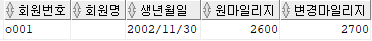 Alias는 회원번호,회원명,생년월일,원 마일리지,